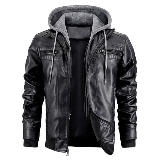 Hooded Jacket With Zipper Pockets Fashion Warm Pu Leather Coat Mens Clothing